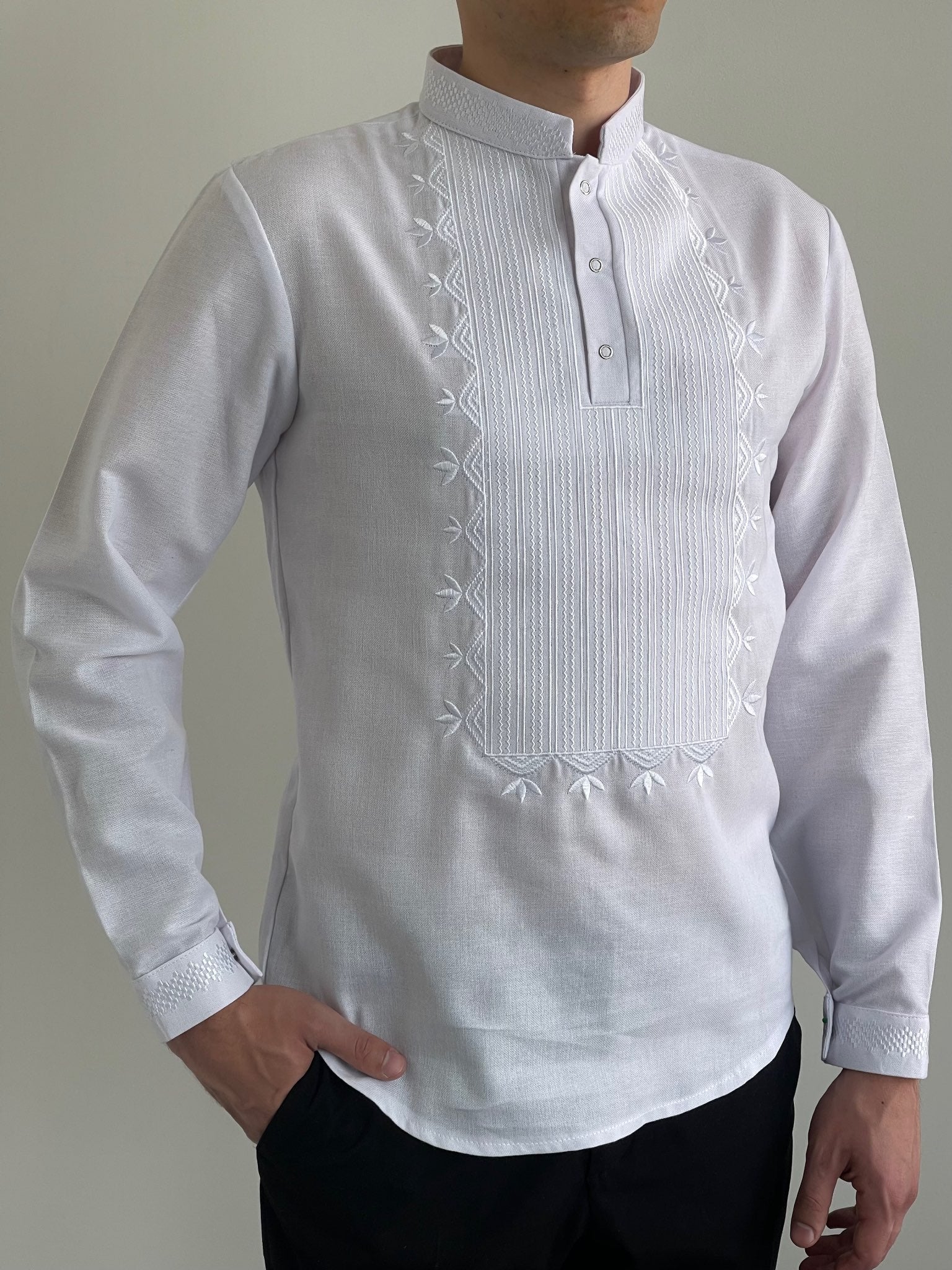 Embroidery with geometric ornament is located on the chest, cuffs, and collar.