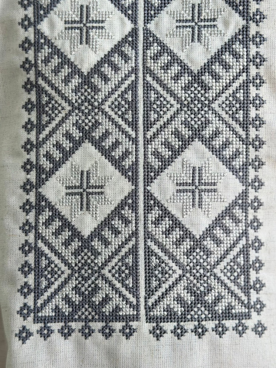 Embroidery with geometric ornament is located on the chest, cuffs, and collar.