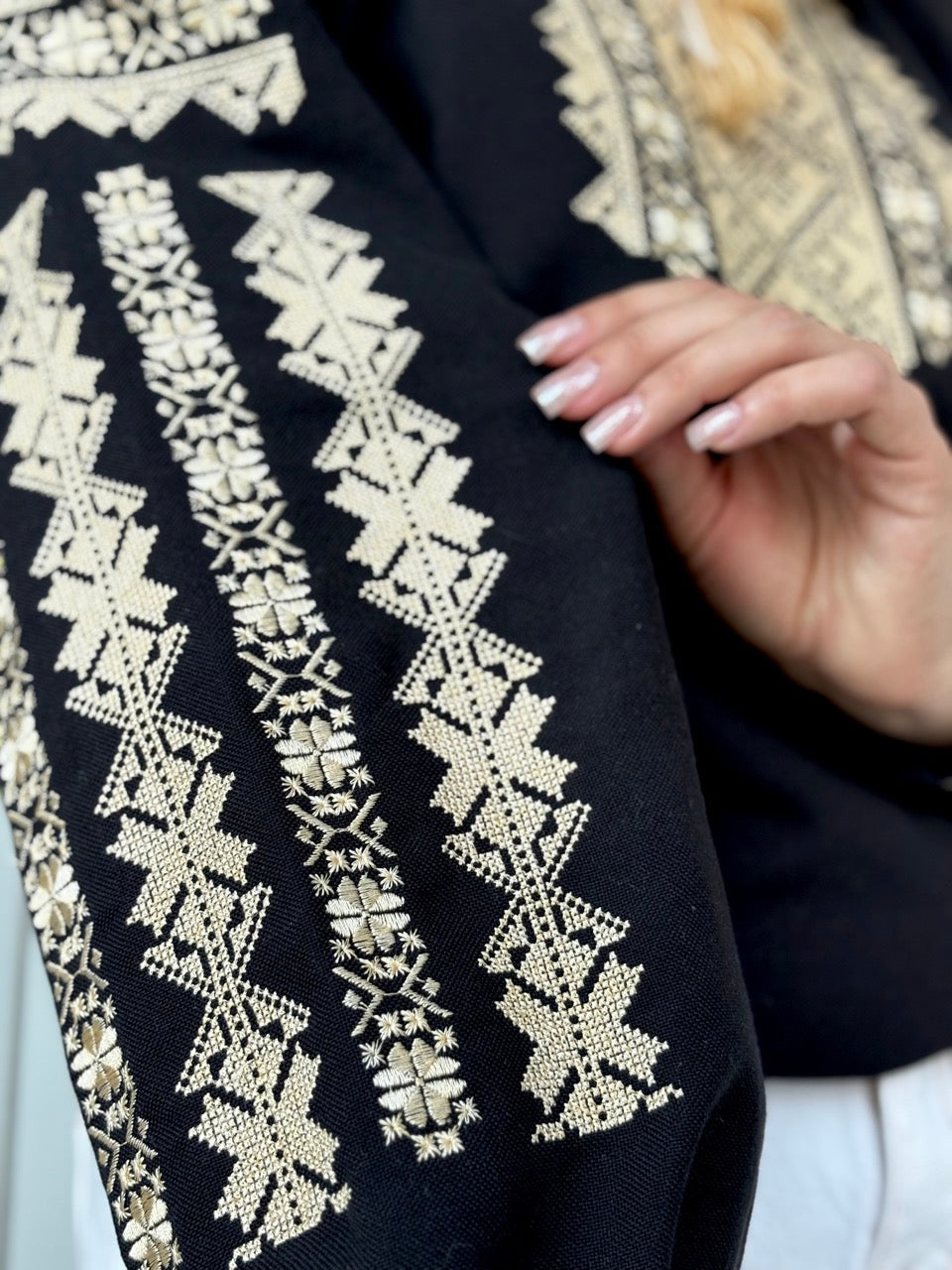 A geometric embroidery is located on the chest and sleeves.