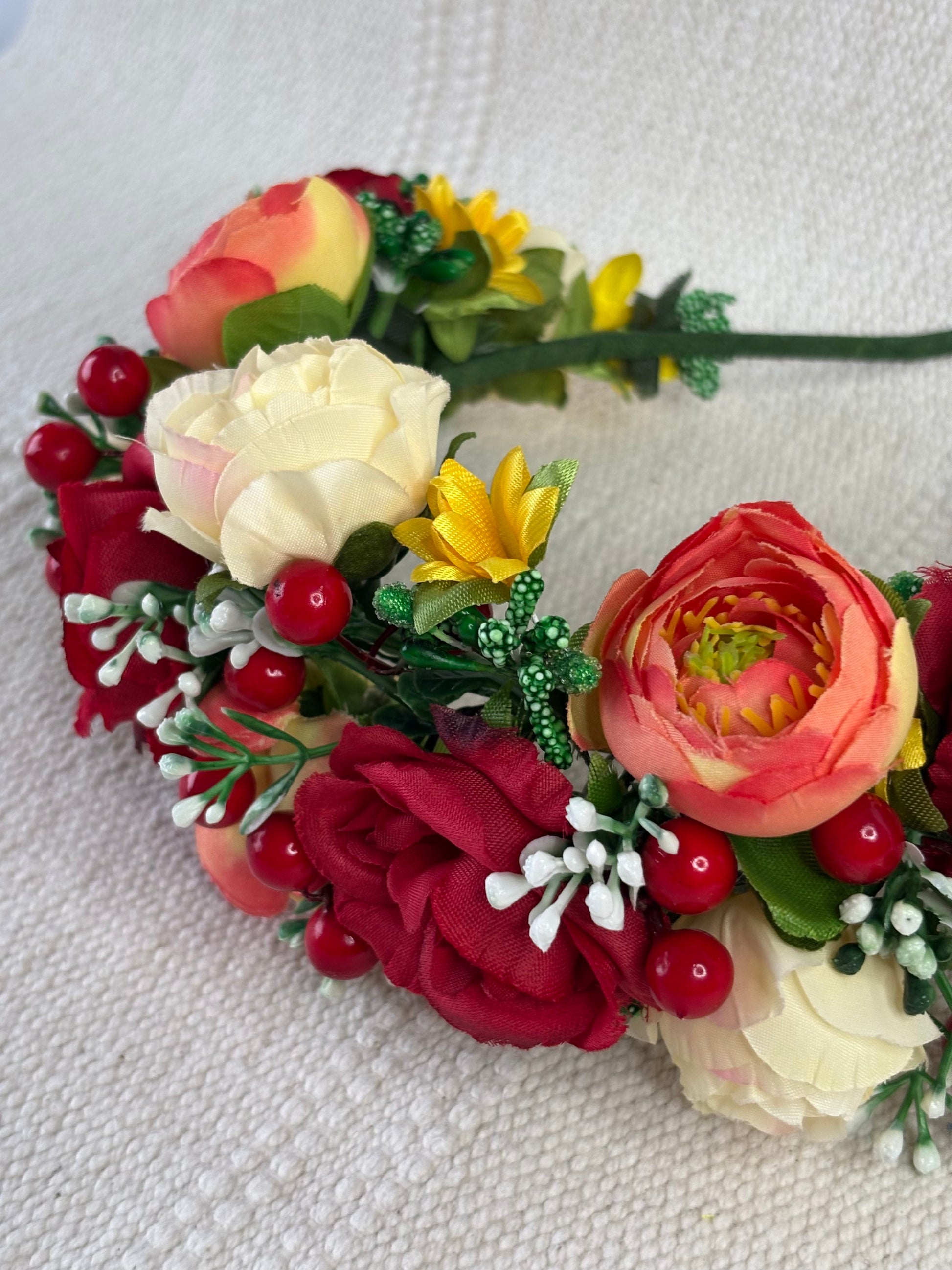 Handmade Flower Crown with Red, Yellow & Coral Flowers