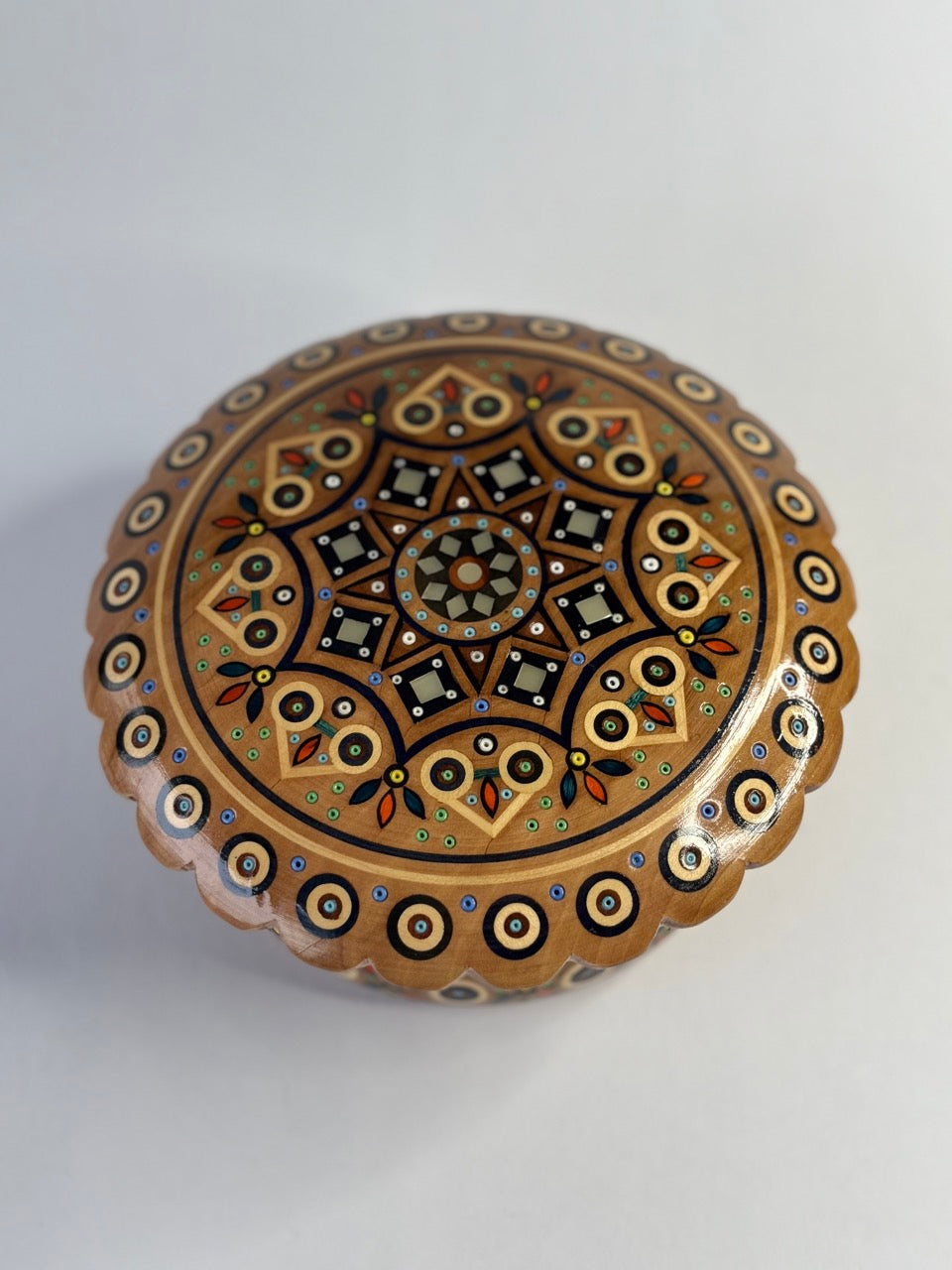 A large, round wooden box with exquisite inlay craftsmanship. Spacious and elegant, it’s perfect for storing keepsakes or adding a touch of class to any room.