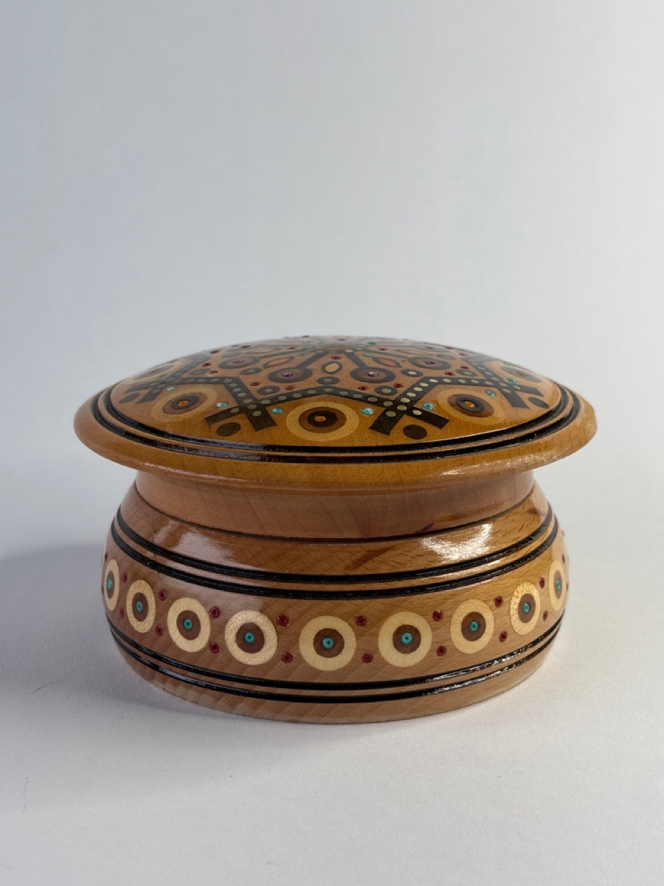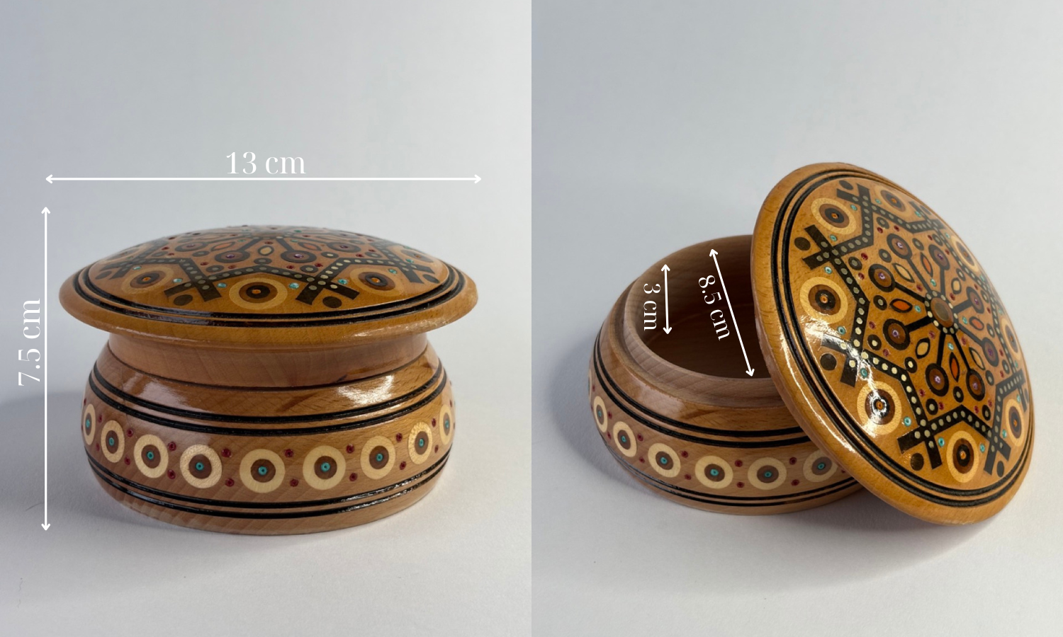 A medium-sized round wooden box with stunning inlay details, handmade to perfection. Ideal for organizing small items or as a unique gift.