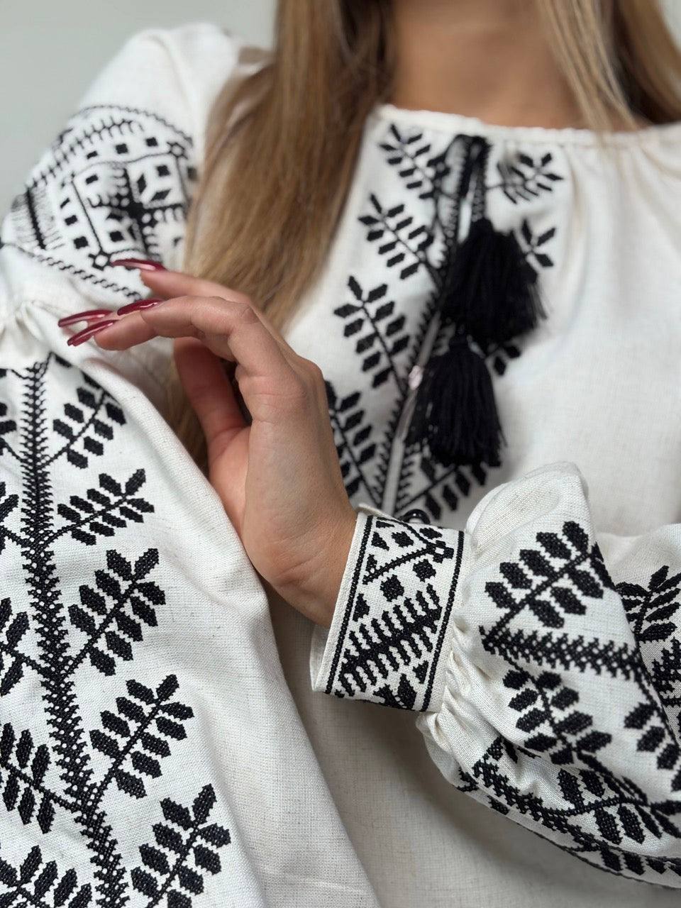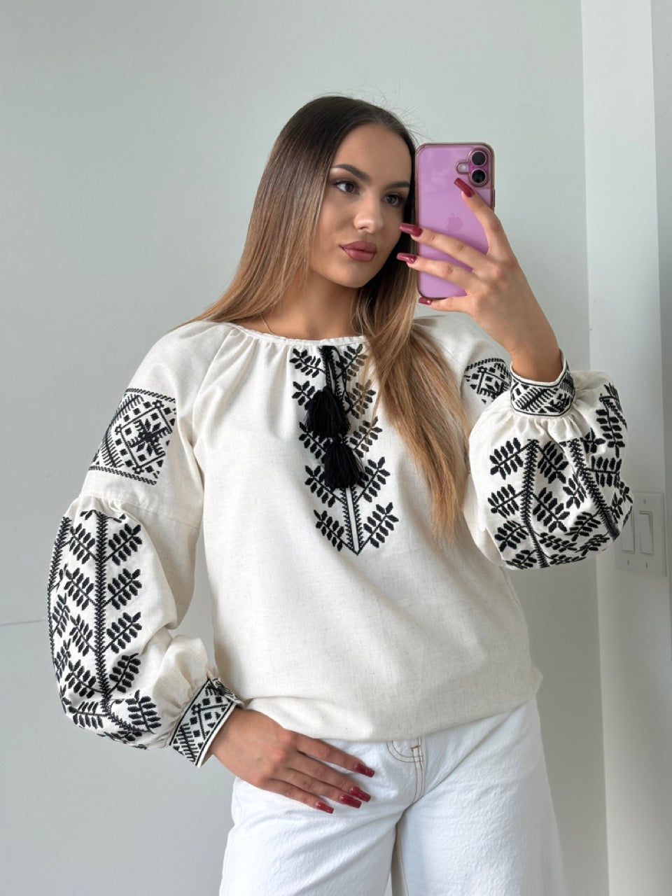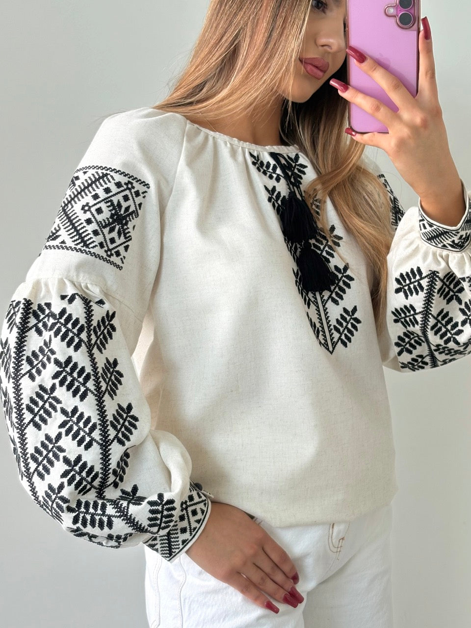 A women's blouse with long, fluffy sleeves and a round neckline that ties with tassels.