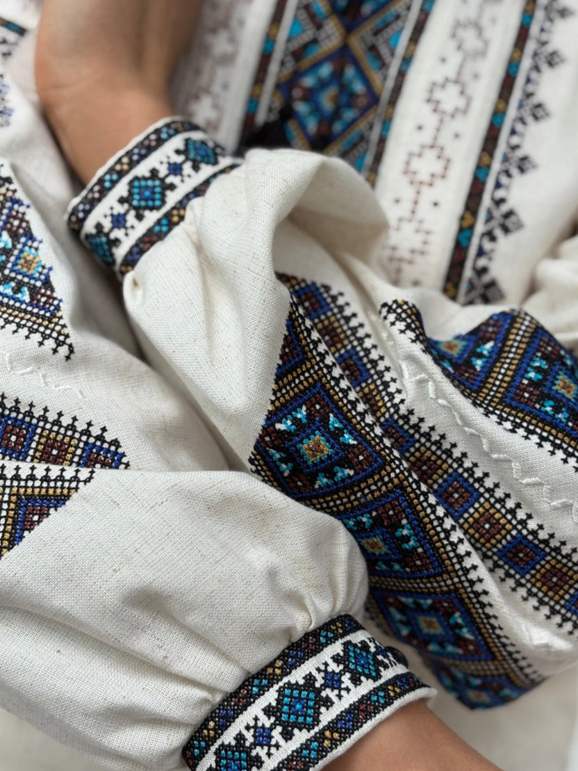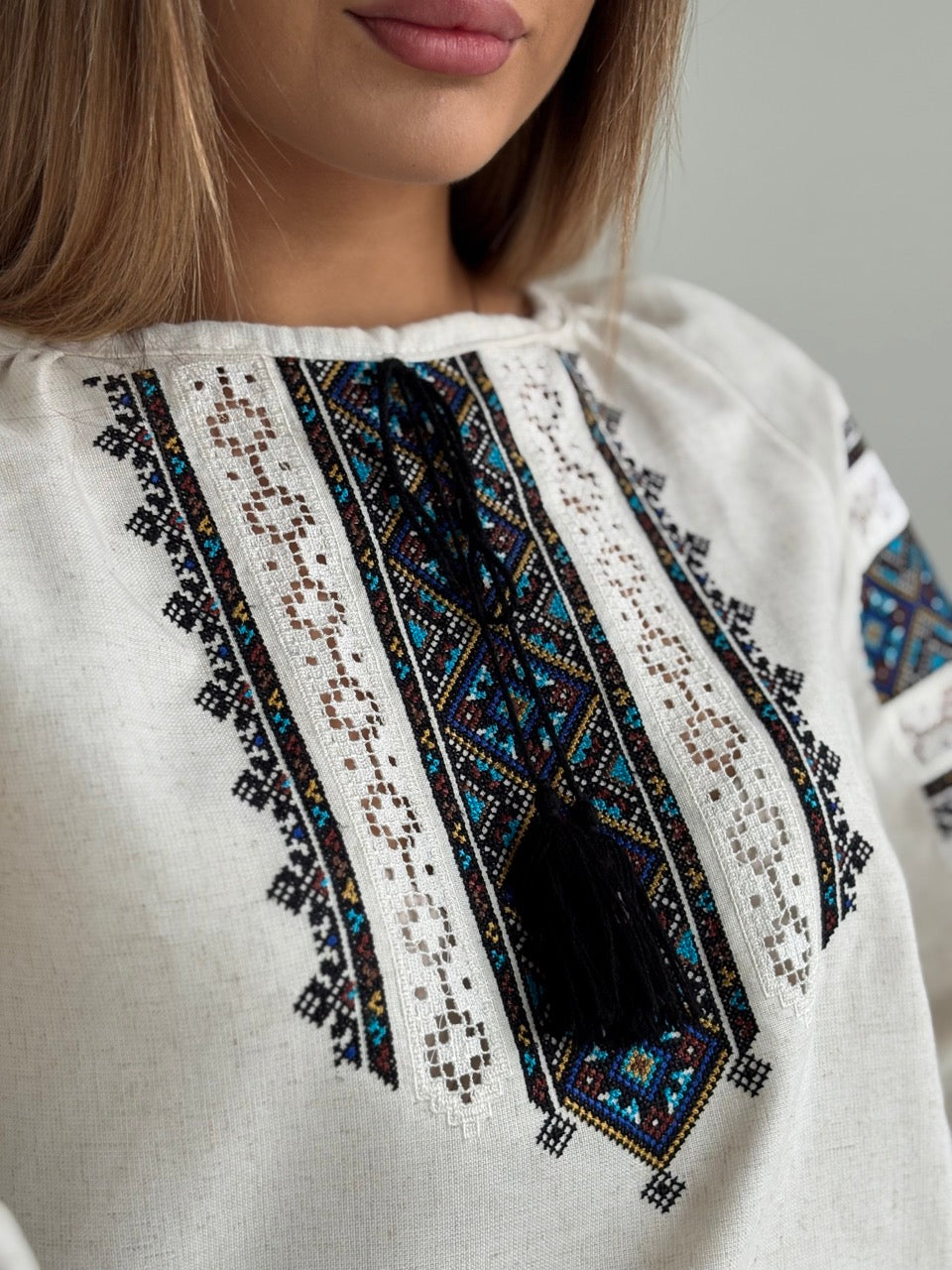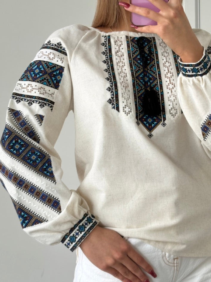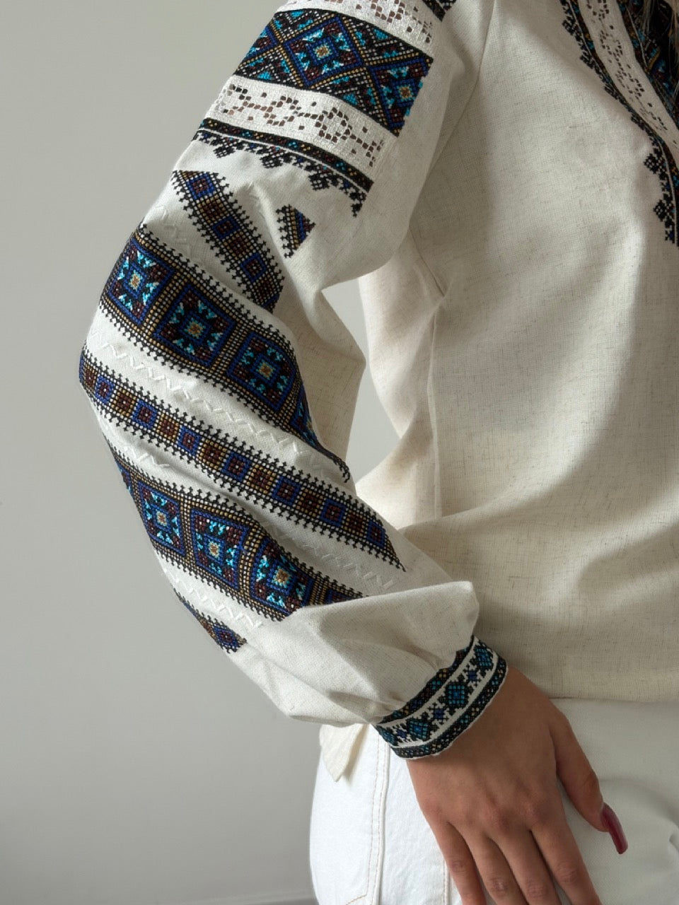 The Linen Blouse with Elegant Blue Embroidery and Richelieu