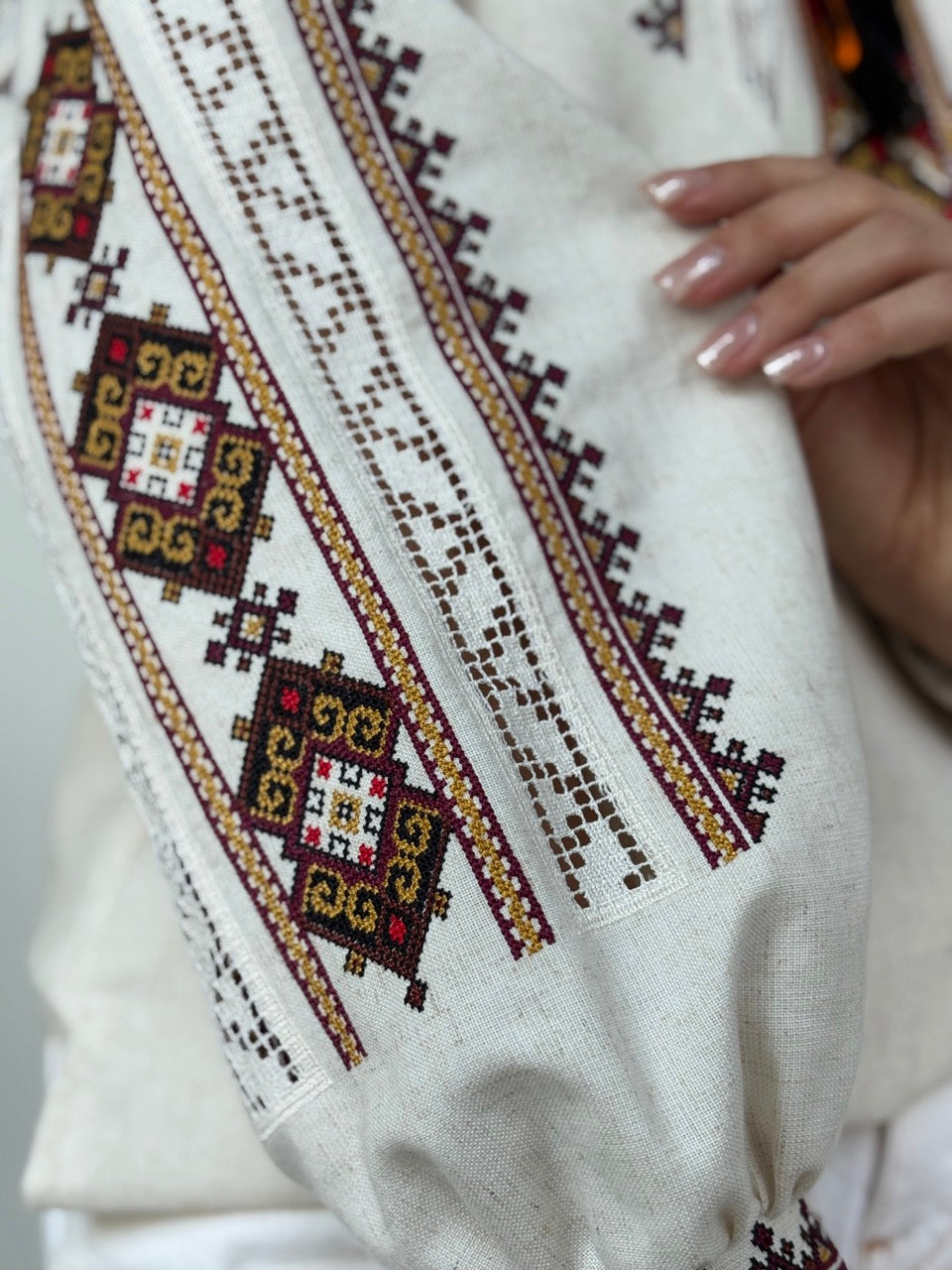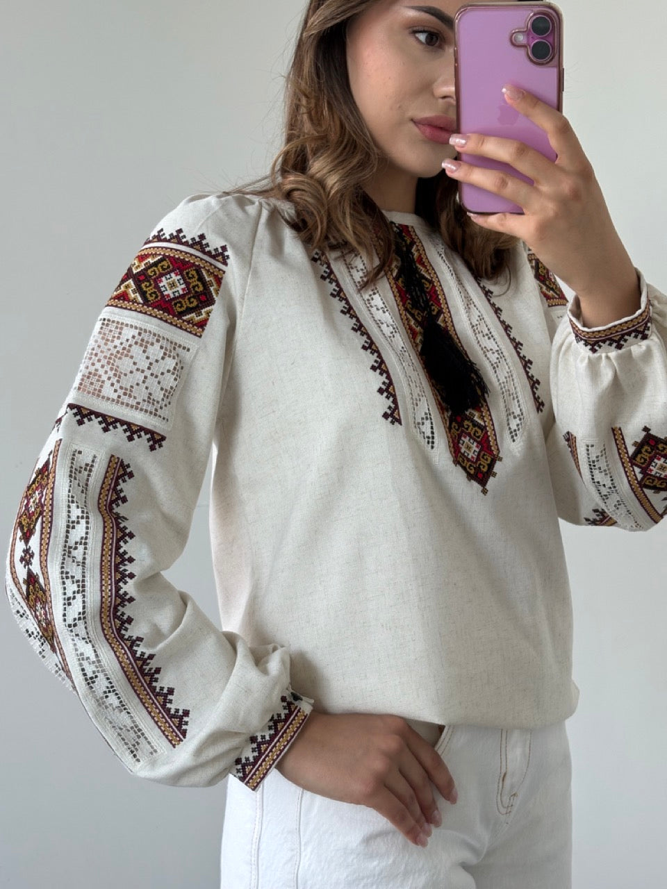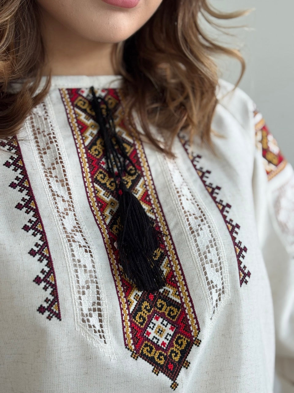 The Linen Blouse with Elegant Red Embroidery and Richelieu