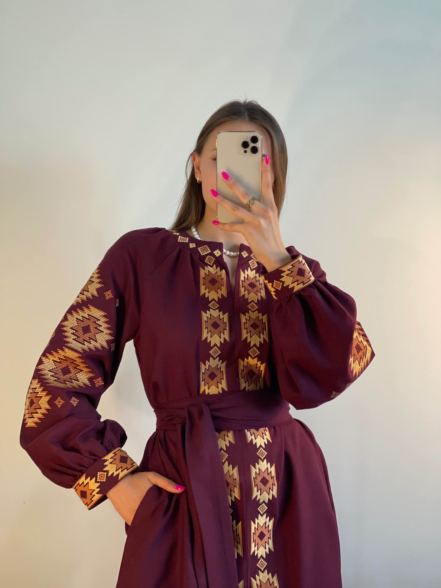 The dress features geometric embroidery on the chest, sleeves, and hemline.
