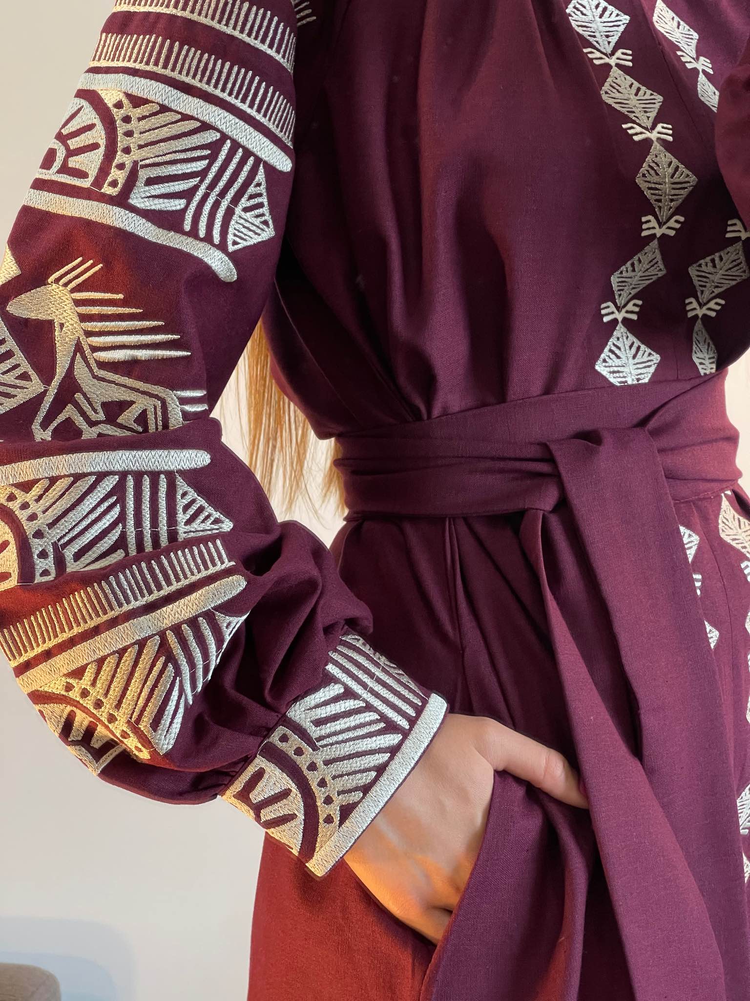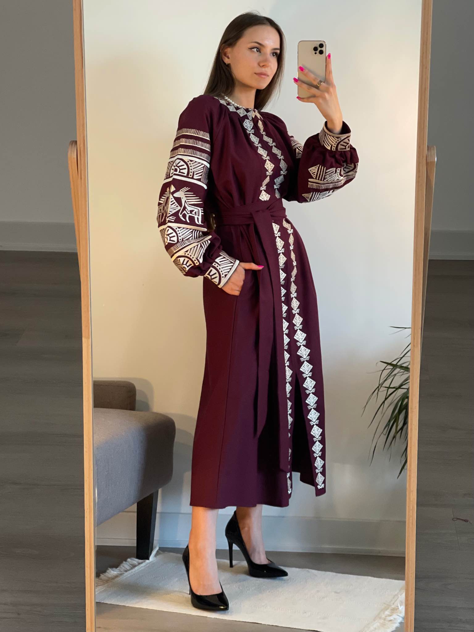 The dress features geometric embroidery on the chest, sleeves, and hemline.