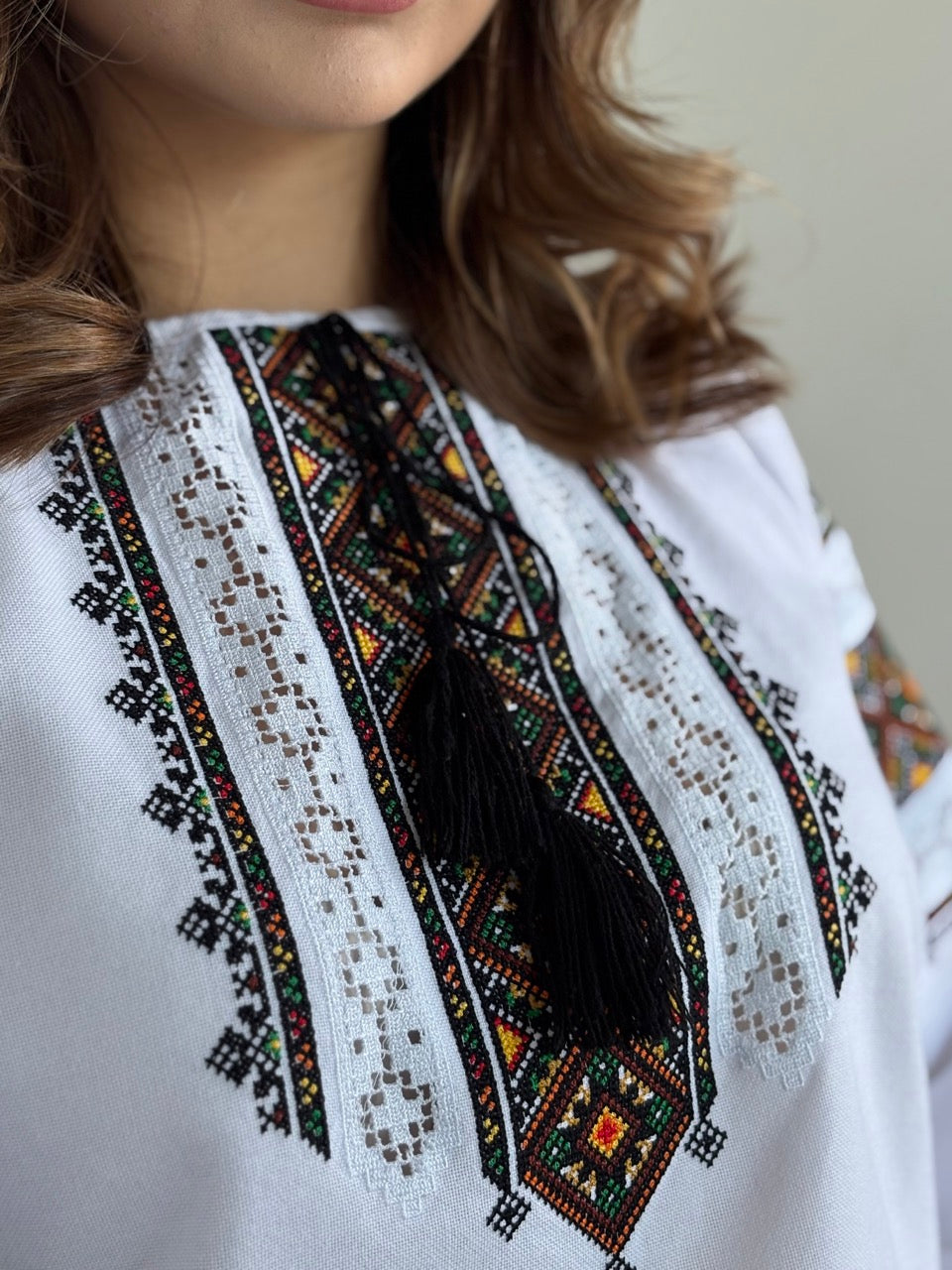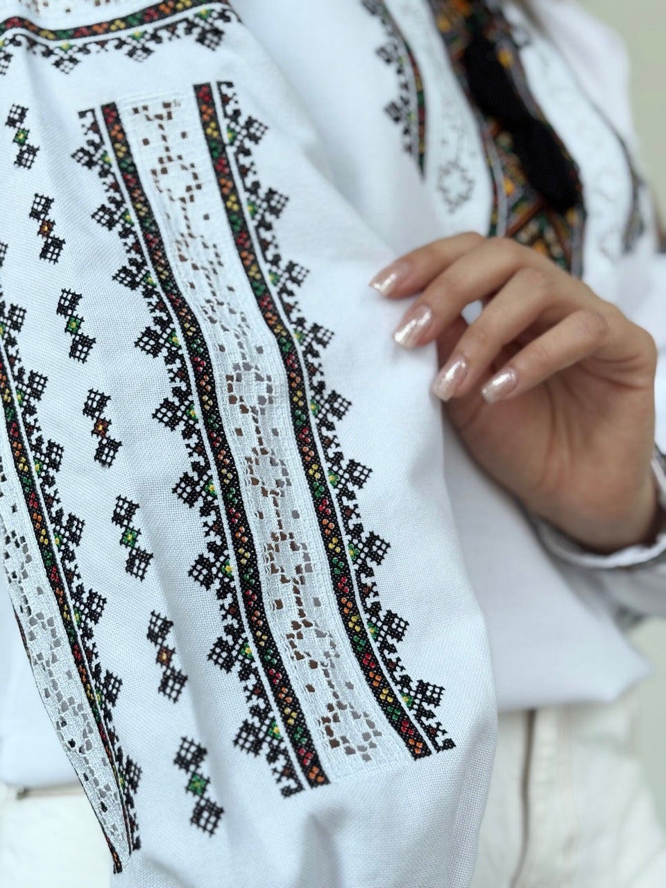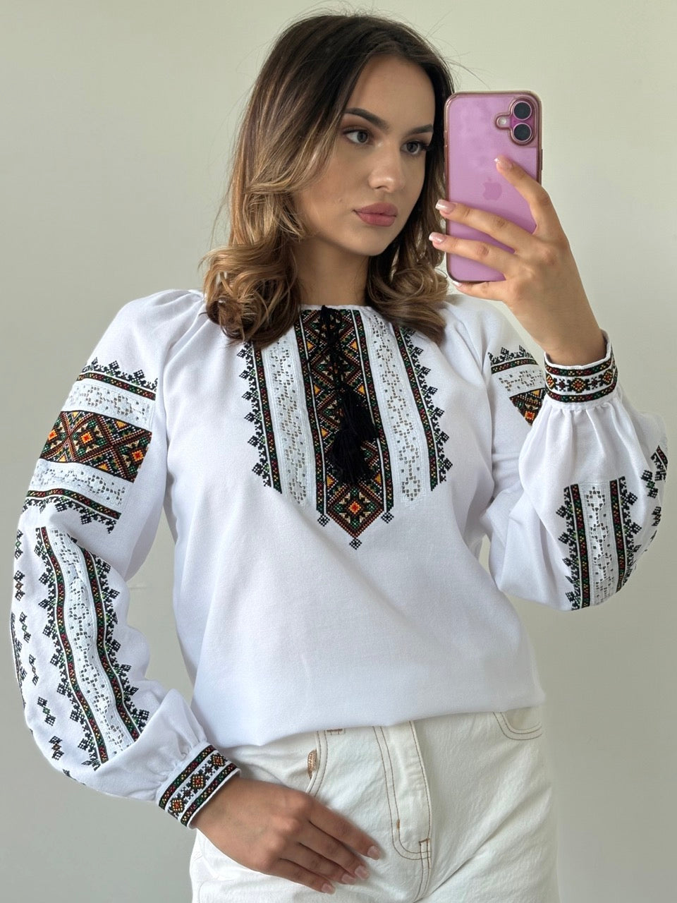 The White Blouse with Elegant Dark Embroidery and Richelieu