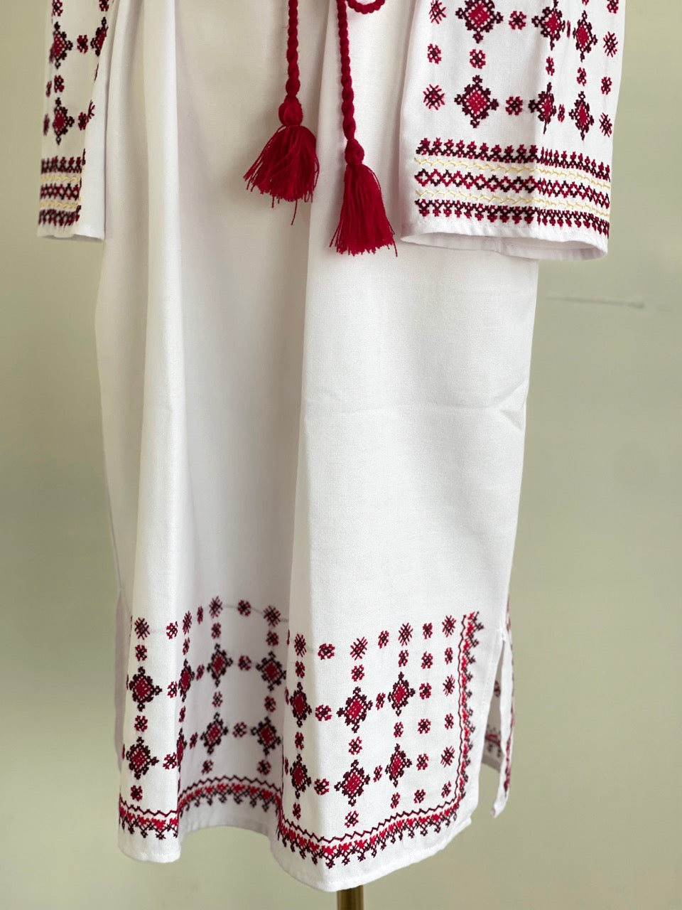 The dress features geometric embroidery on the chest, sleeves, and hemline.