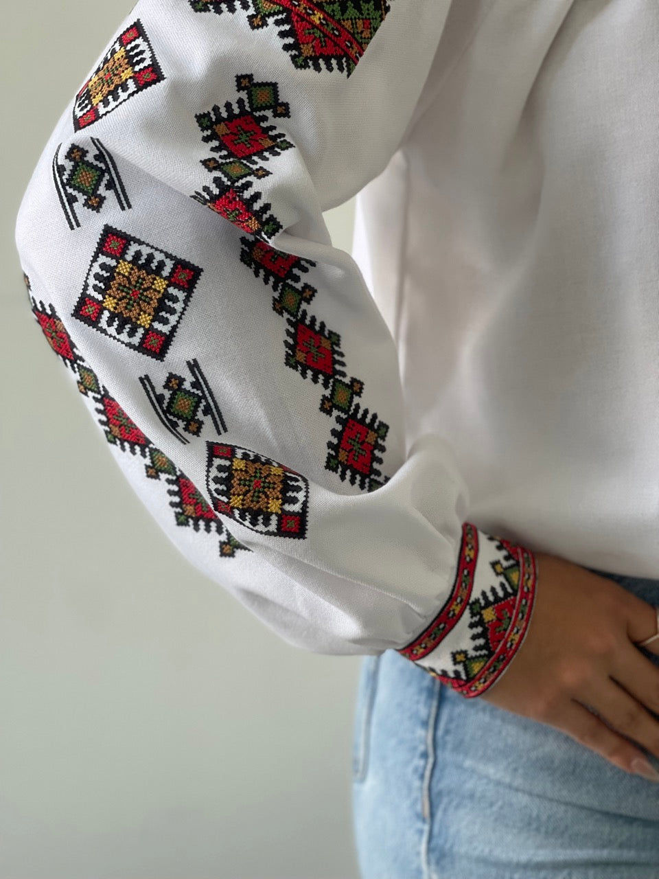 A women's blouse with long, fluffy sleeves and a round neckline that ties with tassels.