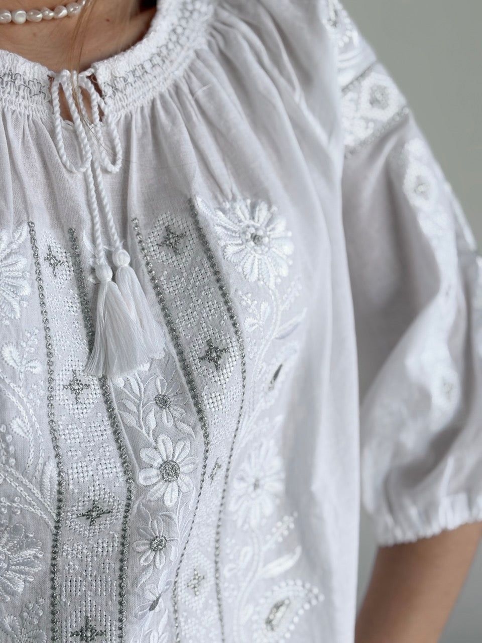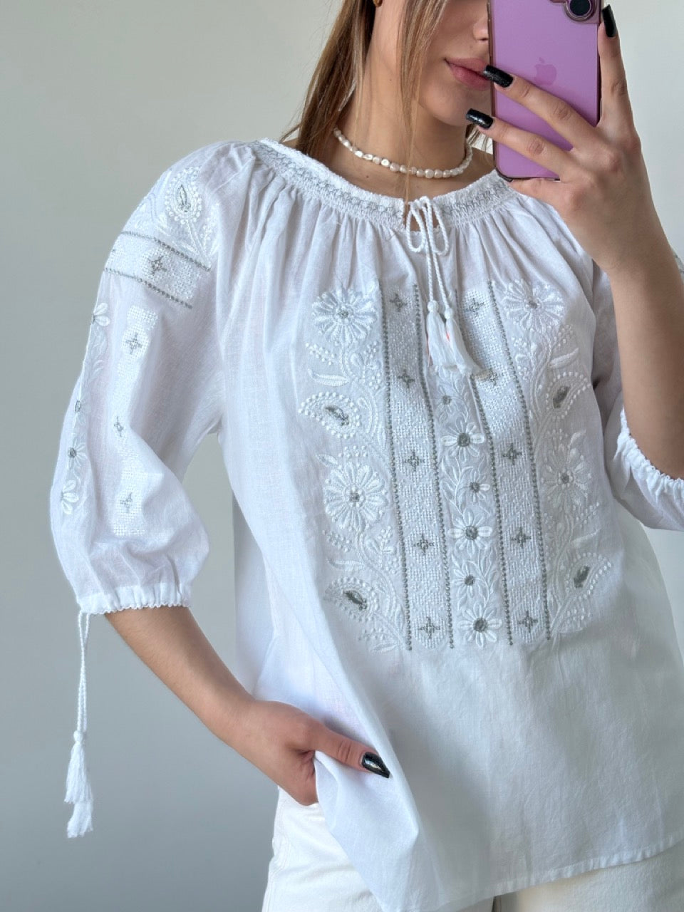 White Batiste 3/4 Sleeve Women's Blouse with White&Grey Embroidery - Pattern 2