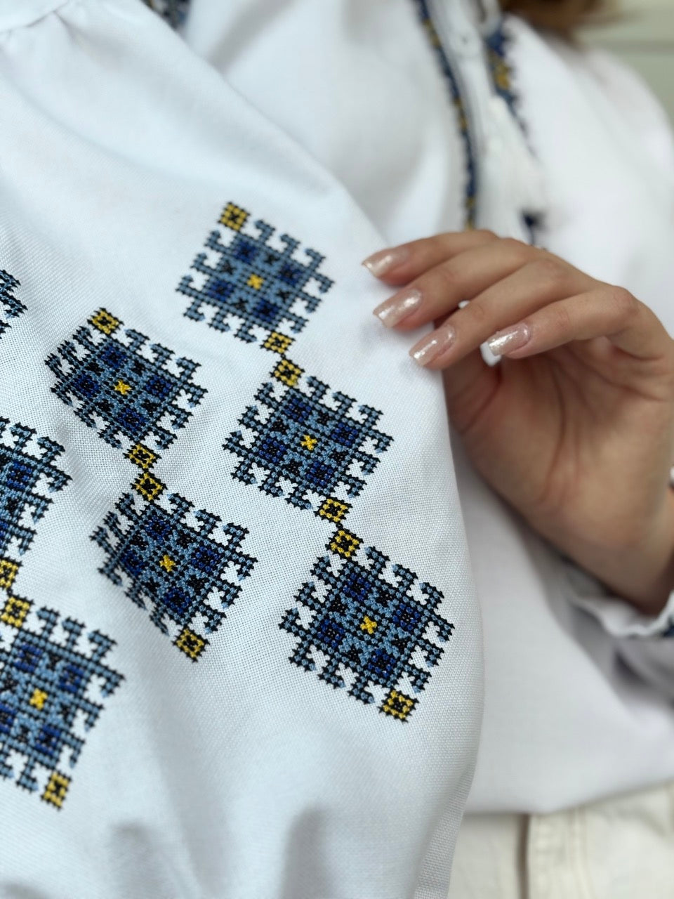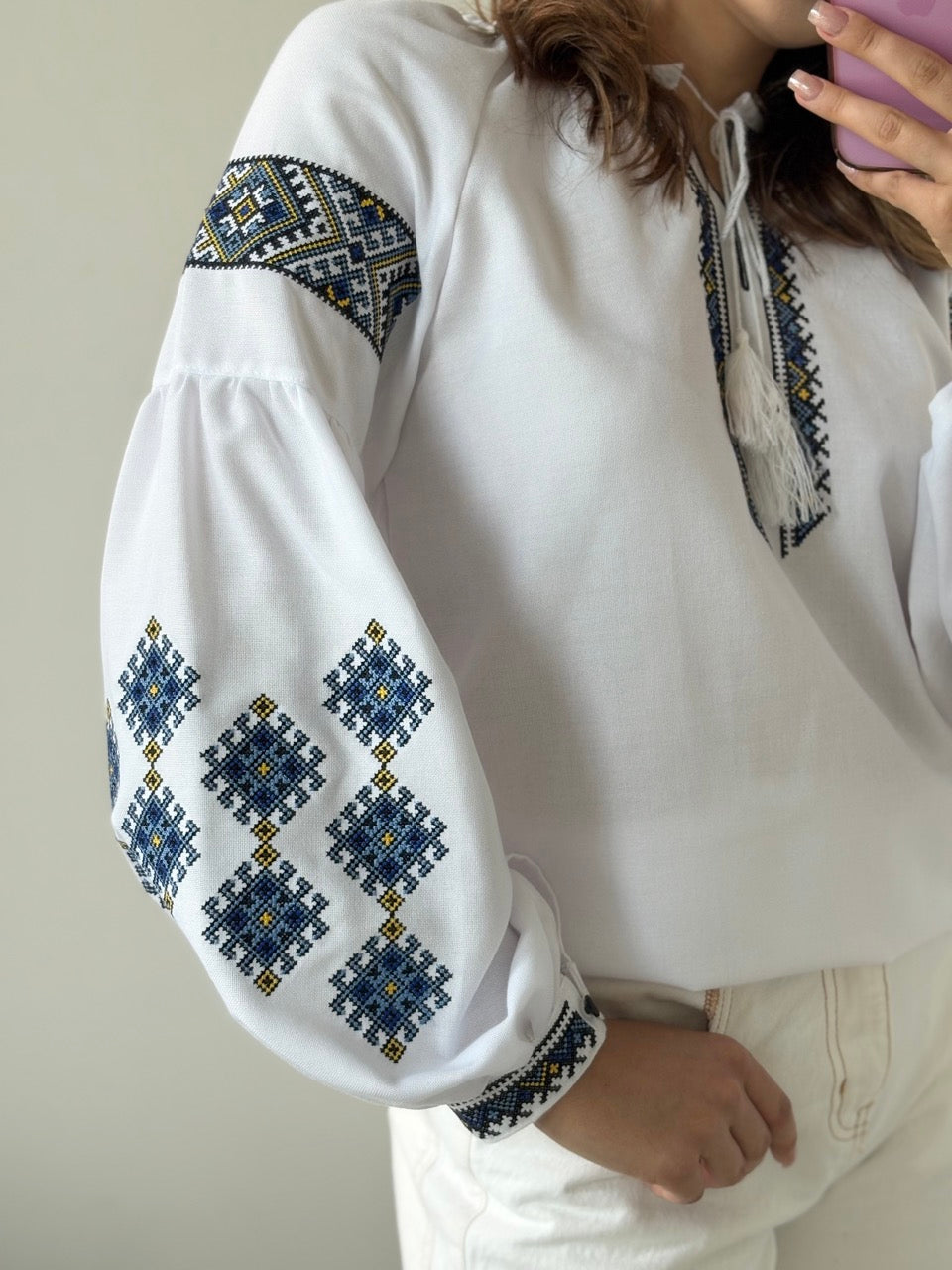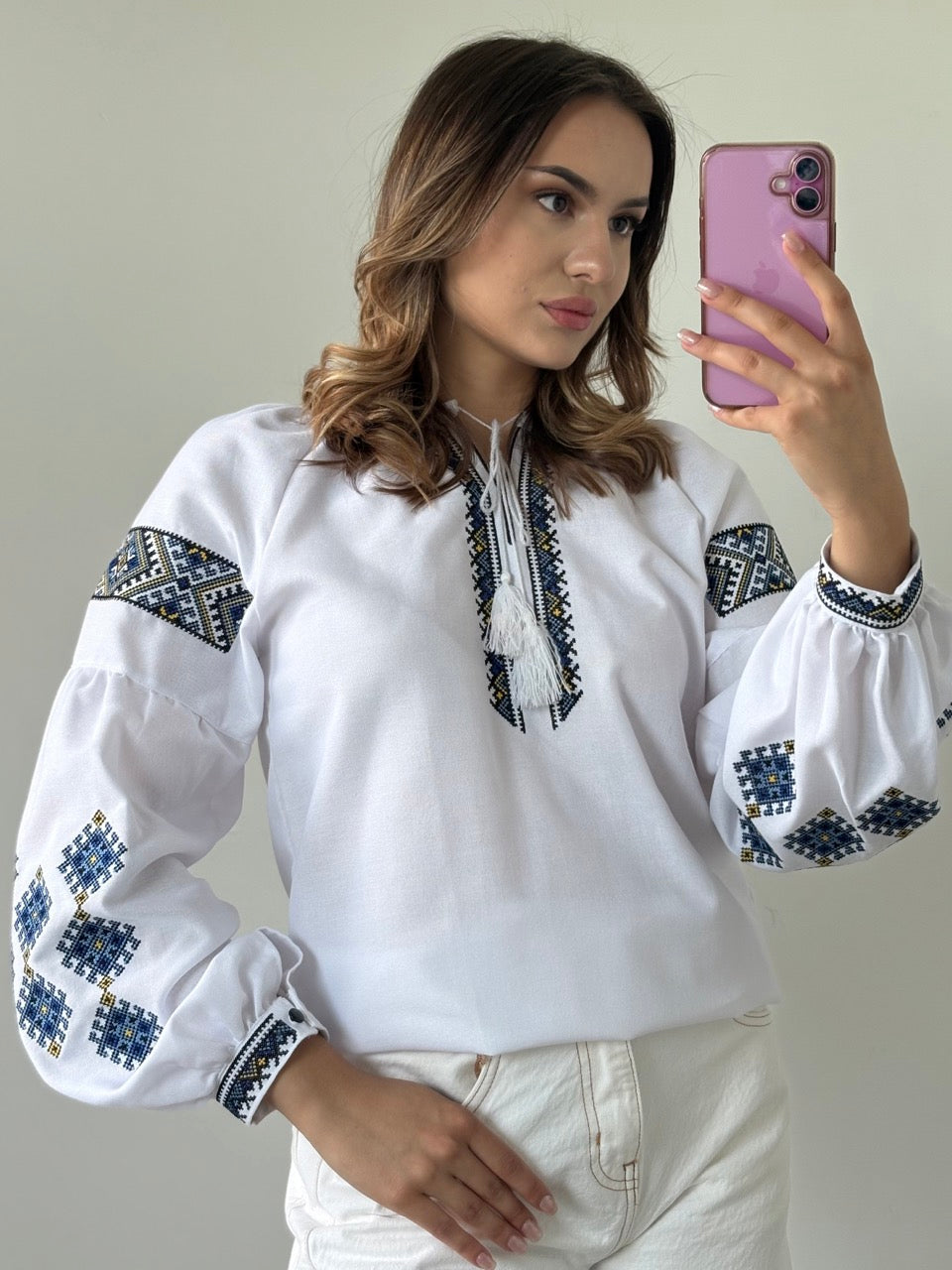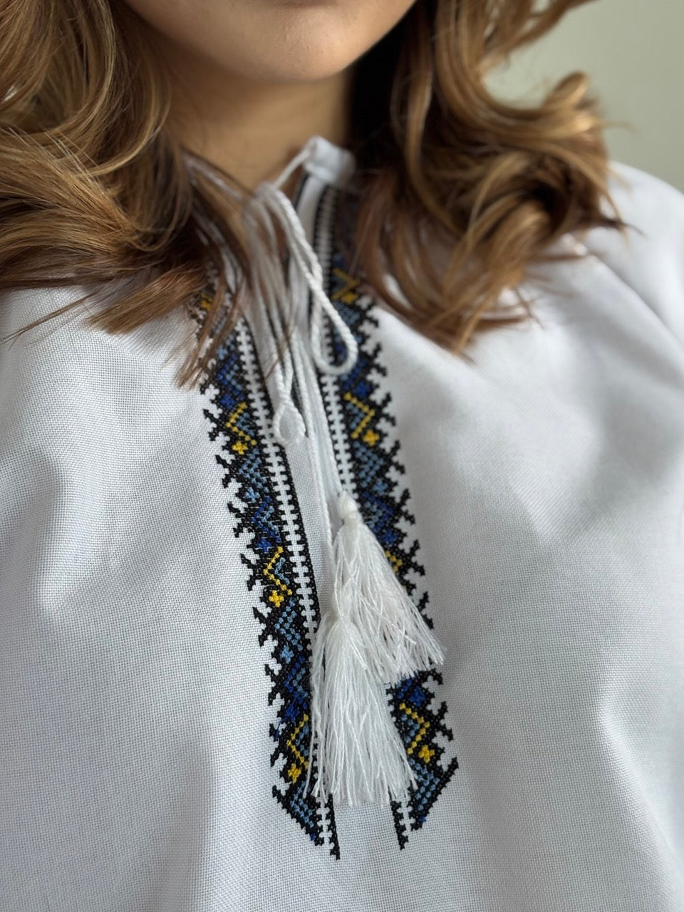 A women's blouse with long, fluffy sleeves and a round neckline that ties with tassels.