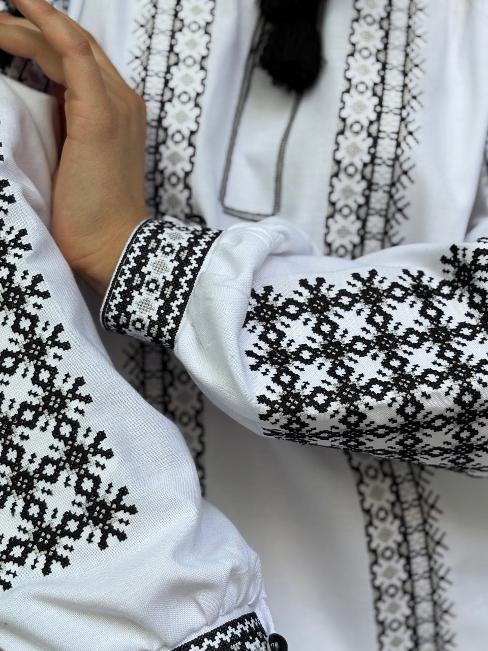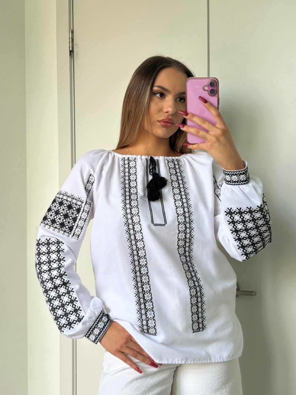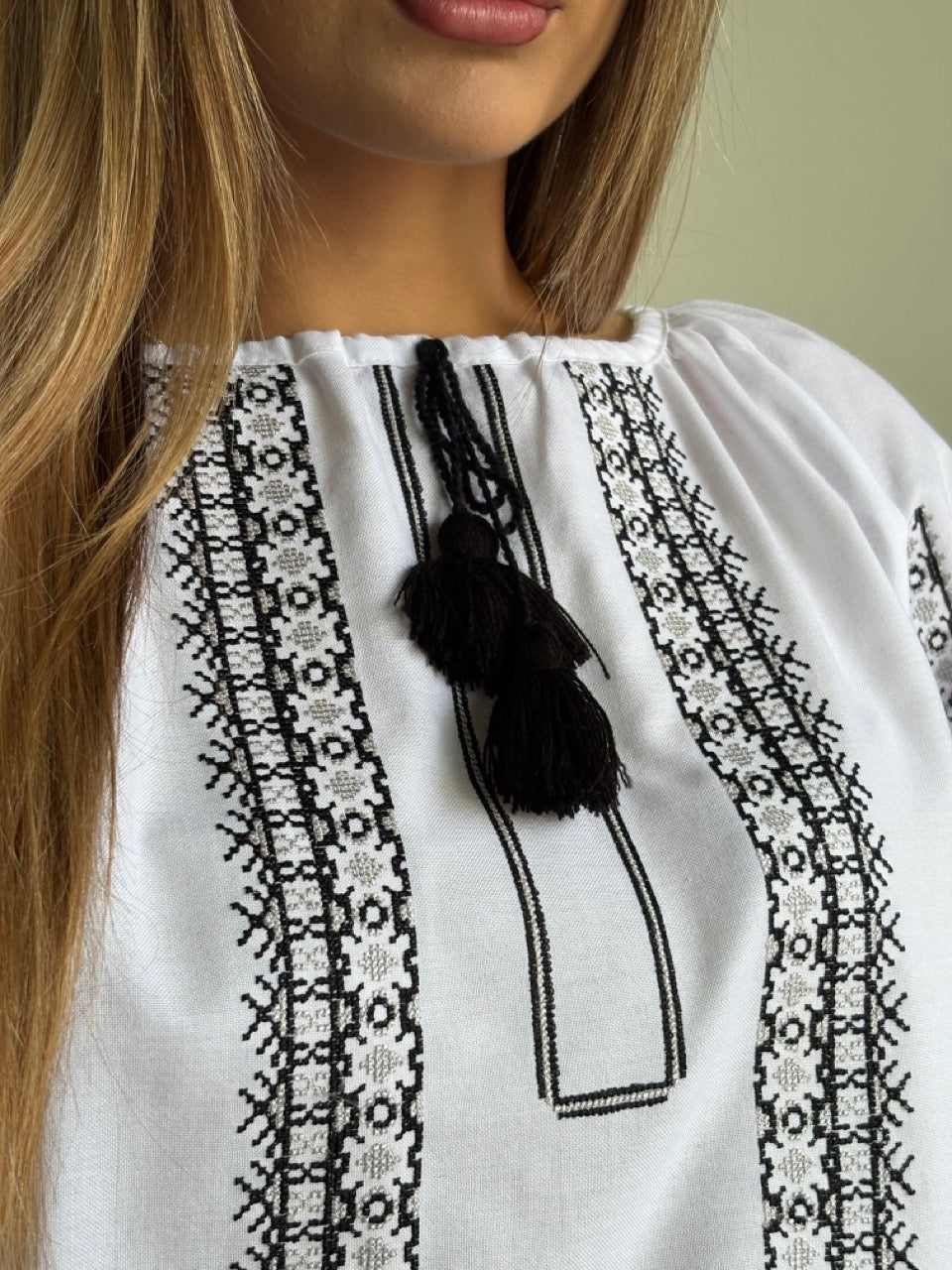 A women's blouse with long, fluffy sleeves and a round neckline that ties with tassels.