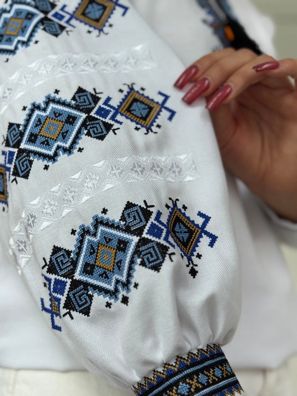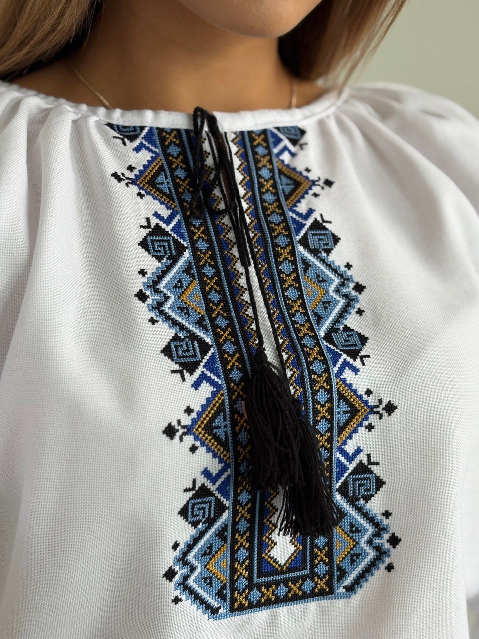 A women's blouse with long, fluffy sleeves and a round neckline that ties with tassels.