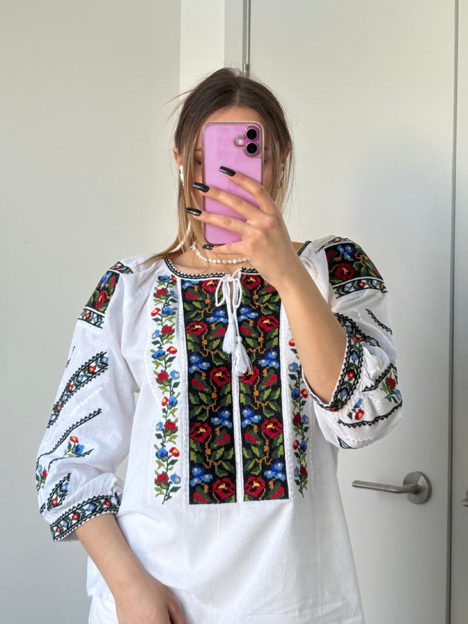 White Embroidered Batiste 3/4 Sleeve Women's Blouse with Flowers - Pattern 3