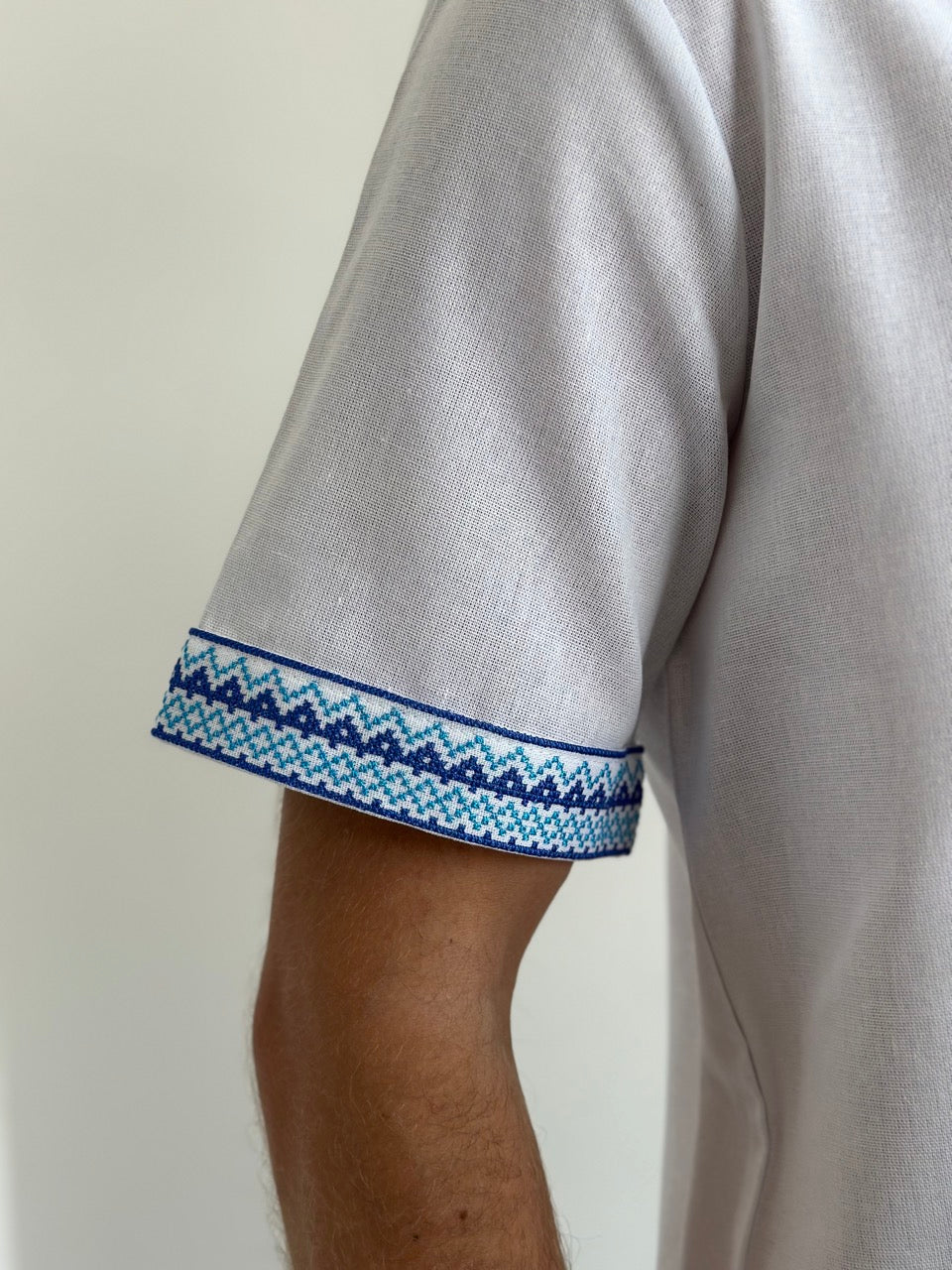 White Men's Vyshyvanka with Short Sleeves and Blue Embroidery