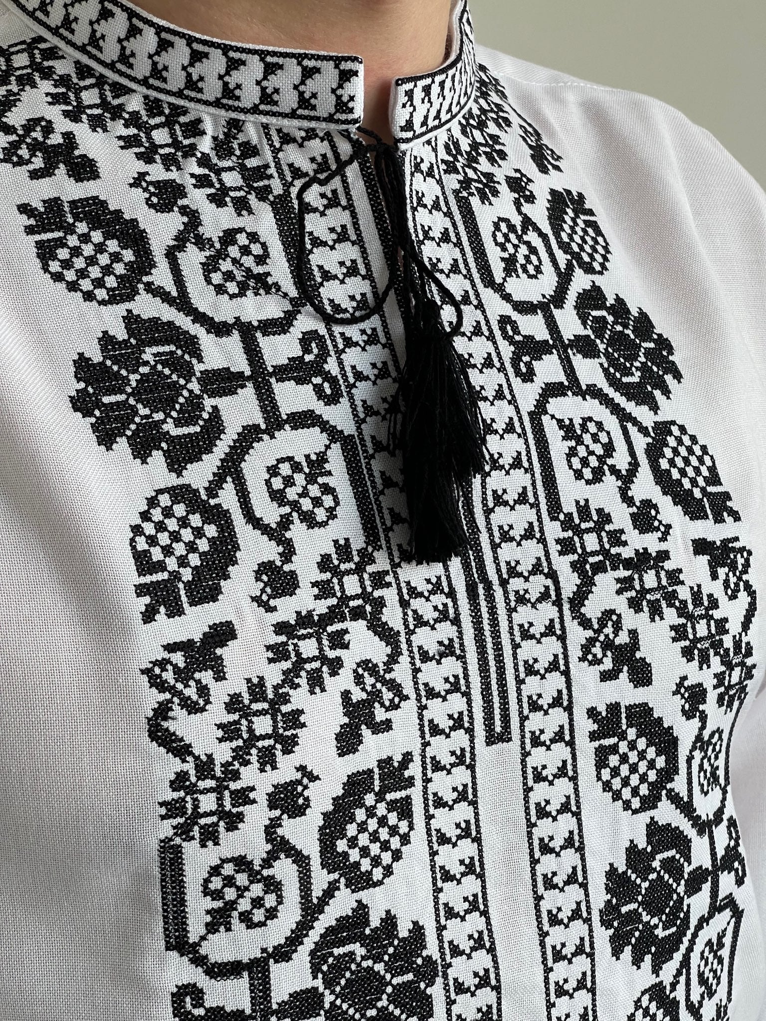Вишивка рослинним орнаментом розташована на грудях, манжетах та на комірі.