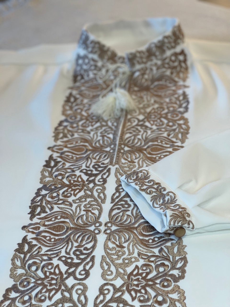 Embroidery with floral ornament is located on the chest, cuffs, and collar.