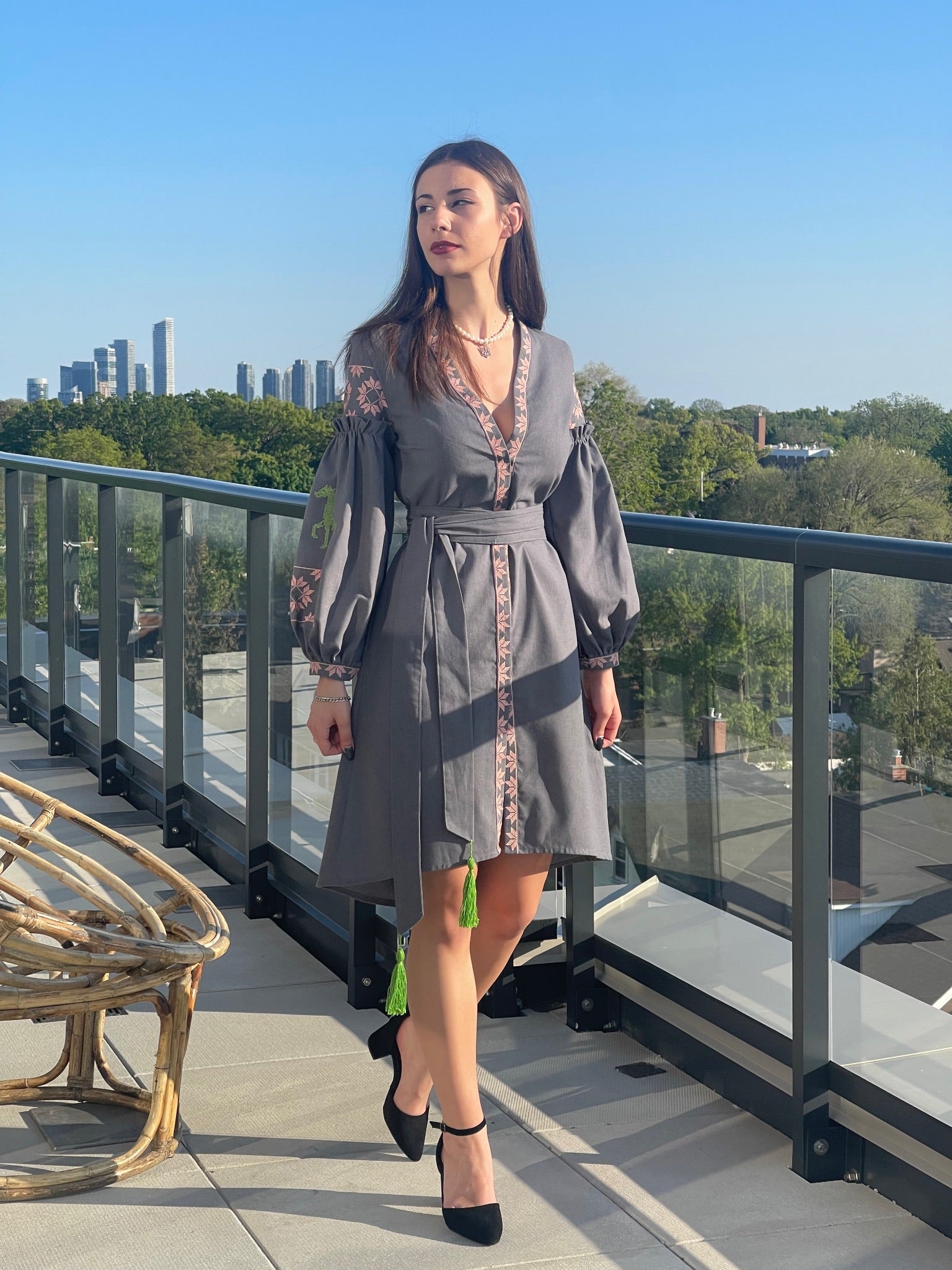 Коротка жіноча сукня з пишними рукавами.
