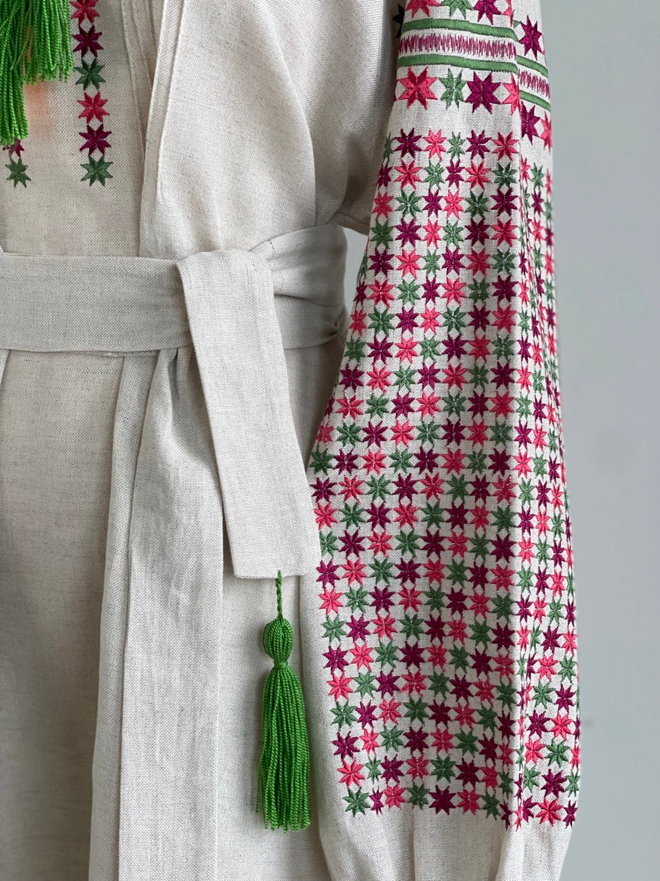 A knee length dress with fluffy sleeves and a round neckline with tassels.
