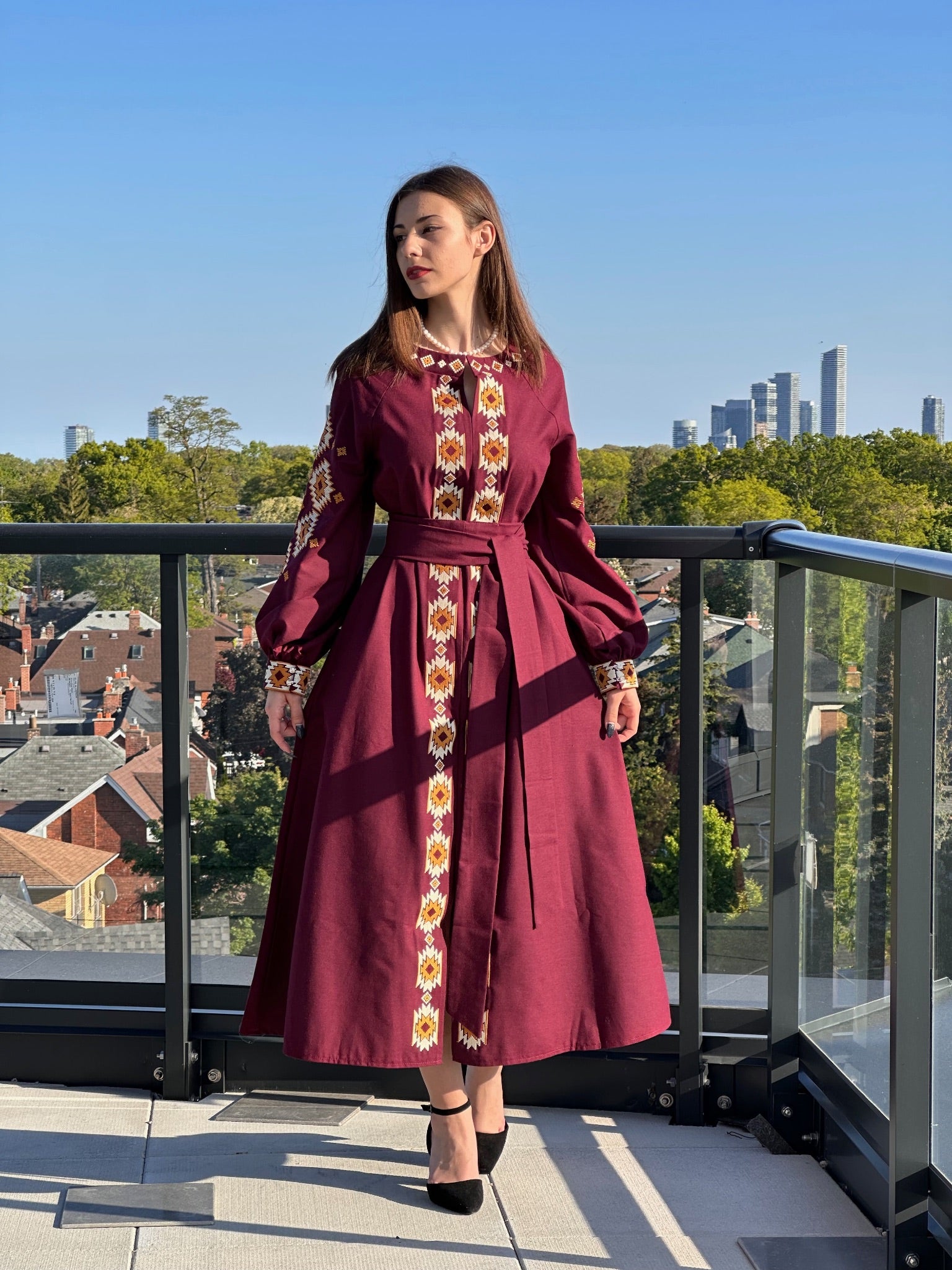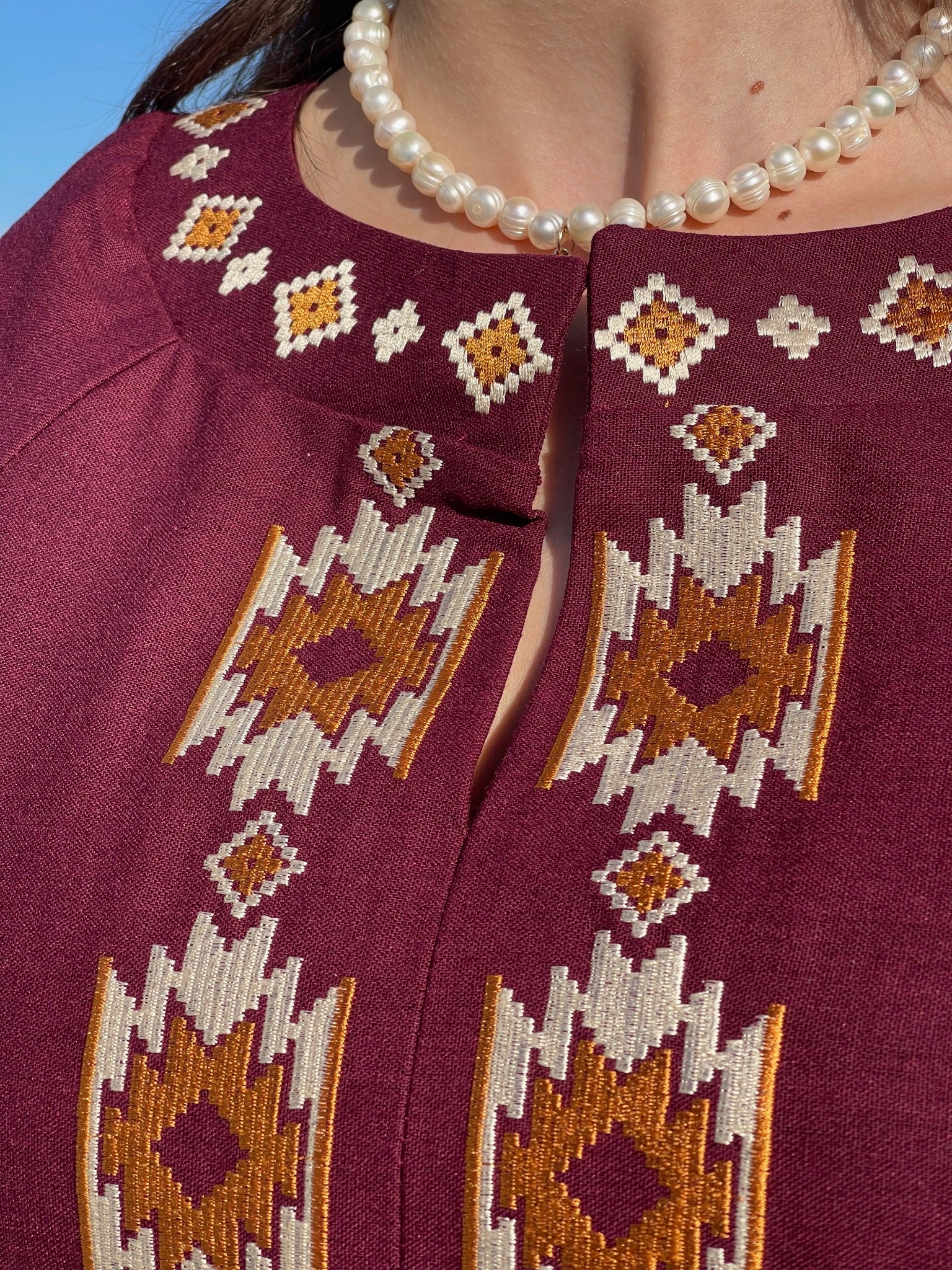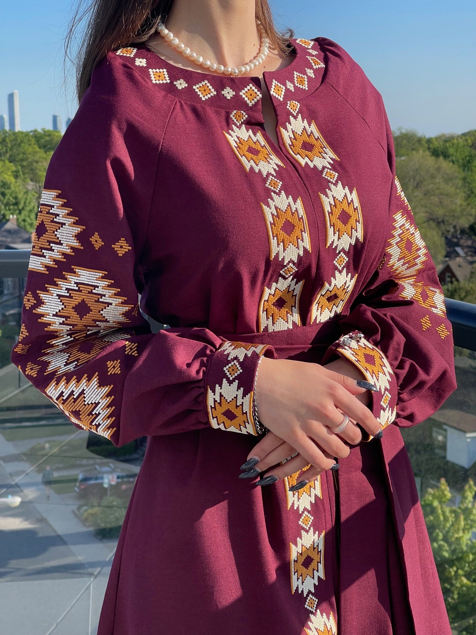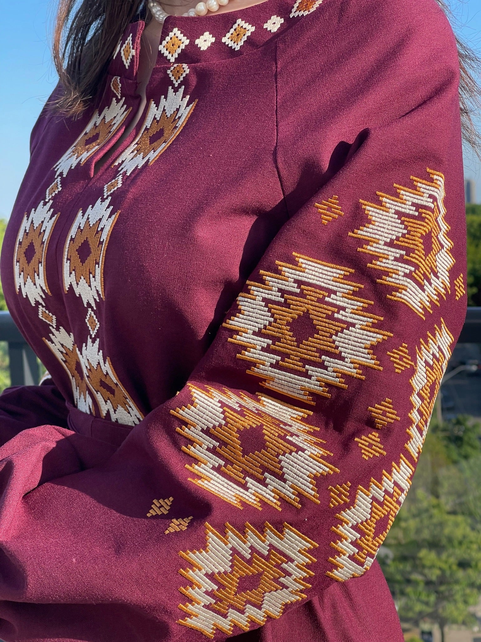 Довге Бордове Плаття з Бежевою і Оранжевою Вишивкою
