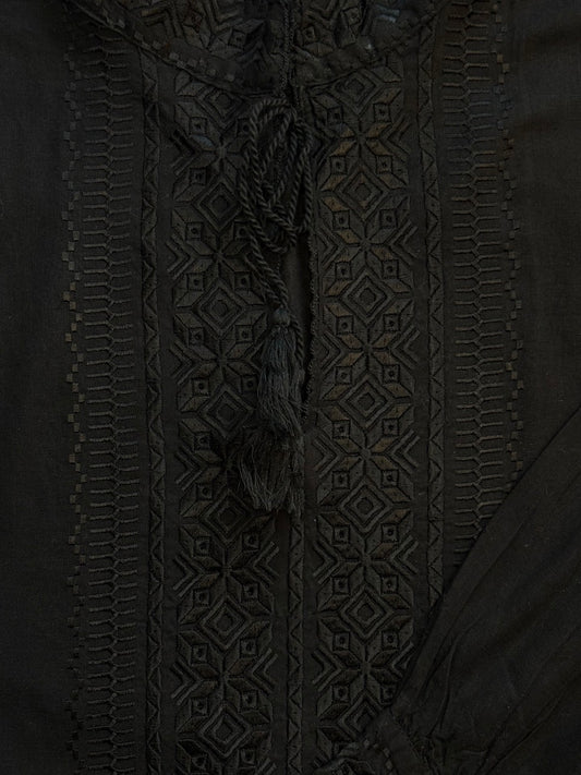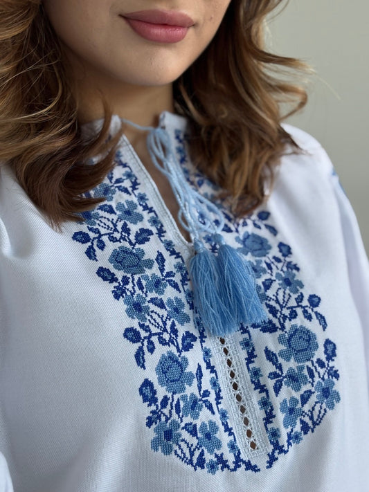 The Linen Blouse with Elegant Blue Embroidery and Richelieu